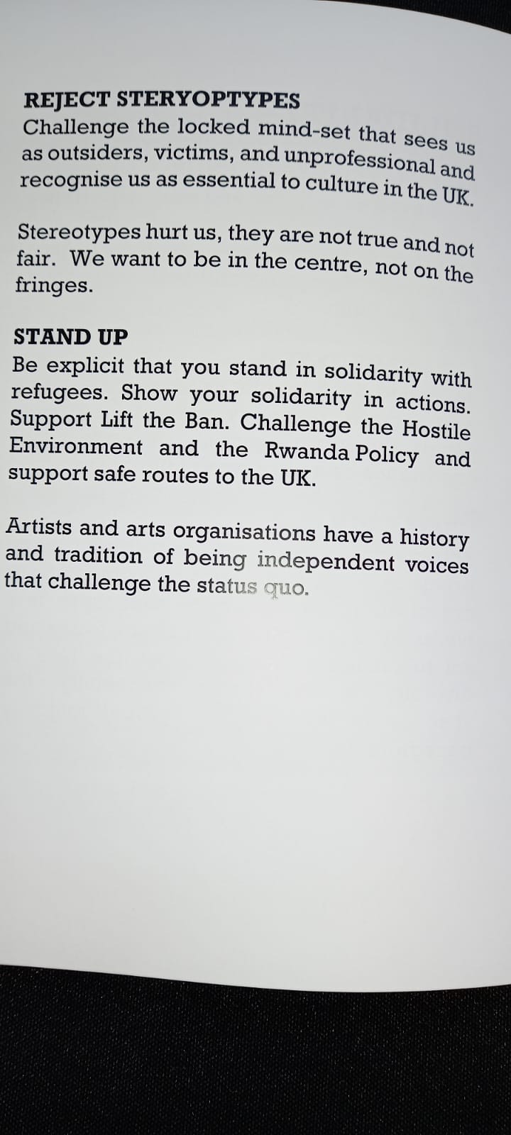 Social justice is critical; artists ask that arts organisations stand in solidarity by supporting campaigns like Lift the Ban and challenge the hostile environment, which results in policies such as the Rwanda scheme and unsafe routes to the UK to seek sanctuary. This solidarity is rooted in the long history of artists and arts organisations being independent voices challenging the status quo.
